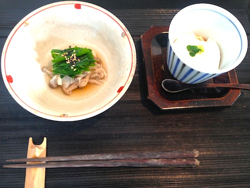 まずは前菜。変わらず、本当に美味しい陶花さん手作りのお豆腐とキノコのお浸し。