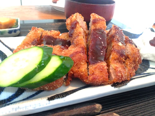 来ました、柿豚トンカツ。すごいボリュームです。オリジナル梅ソースが添えてあります。